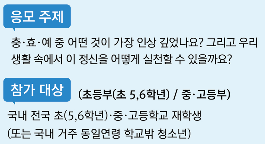 대회는 청소년(초·중·고등학생)들에게 권장되고 있으며, 성인 부문도 있어 다양한 연령대가 함께 참여할 수 있습니다. 한국 전통 가치에 대해 깊이 고민하고 자신의 시각을 표현하는 기회를 제공하는 의미 있는 행사입니다.